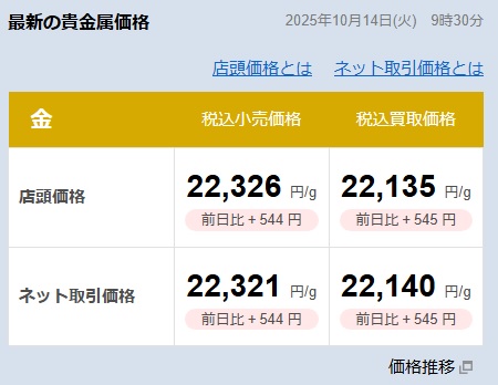 … | 66無念Nameとしあき25/10/14(火)09:38:48 ID:j6RB2ALYNo.1358617343そうだねx1>田中貴金属の今日の金小売価格22326円なので |