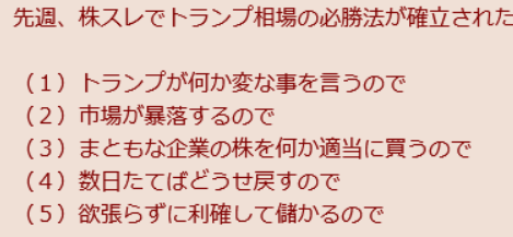 … | 10無念Nameとしあき25/10/14(火)09:33:05 ID:v7/DqFAMNo.1358616661+>これじゃあ三連休中にドヤ顔で「火曜日大暴落するから覚悟しといた方がいいぜ?俺は金曜日に売っちゃったけどさぁ、まあ今年最後の買い場になるんじゃないかな、フフッ😏」って言い回った僕が馬鹿みたいじゃ無いですかので! |