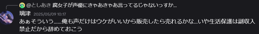 … | 473無念Nameとしあき25/10/14(火)19:38:20No.1358729219そうだねx5声がいいのもID出されて自演バレしてたよね… |