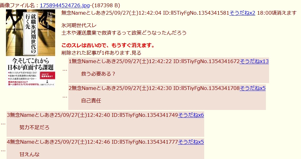 … | 34無念Nameとしあき25/10/15(水)02:47:11No.1358826094そうだねx1氷河期はもうどうにもならないので |