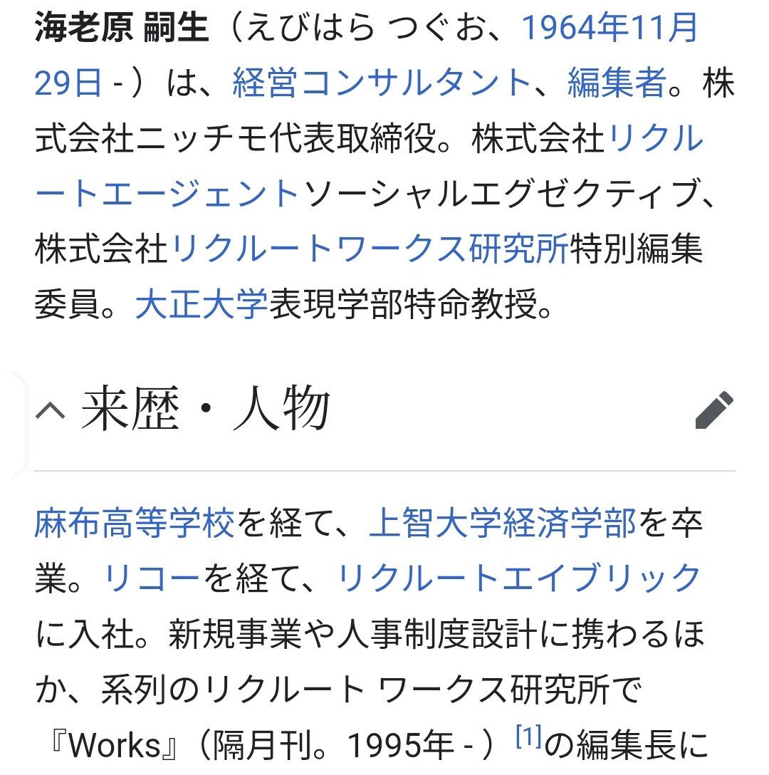 … | 54無念Nameとしあき25/10/15(水)07:32:55No.1358836170+海老原 嗣生(えびはら つぐお、1964年11月29日 - )は、経営コンサルタント、編集者。株式会社ニッチモ代表取締役。株式会社リクルートエージェントソーシャルエグゼクティブ、株式会社リクルートワークス研究所特別編集委員。大正大学表現学部特命教授。 |