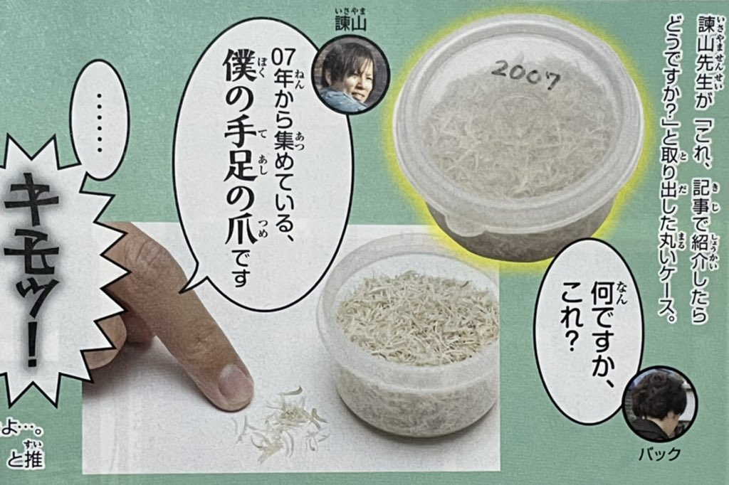 … | 53無念Nameとしあき25/10/15(水)00:02:19No.1358807293+諌山先生て自分の爪集めて記録してるんだよな |