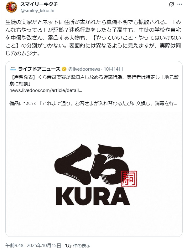 … | 455無念Nameとしあき25/10/15(水)17:42:42No.1358925915そうだねx1今回の寿司ペロ族に今の心境聞いてみたい |