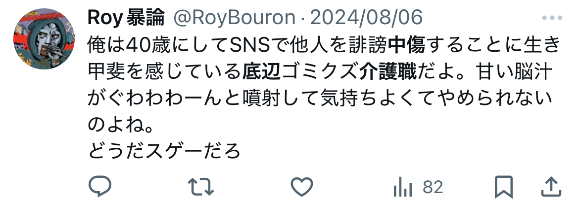 … | 14無念Nameとしあき25/10/15(水)19:18:16No.1358949044+俺も半年くらいかけて誹謗中傷開示したら相手が障害持ち手取り12万の介護職で賠償金取れなかったんだけどやっぱ底辺職だけあって暇で金無いから荒らしなんてやるんだろうな |