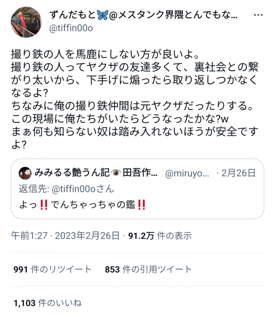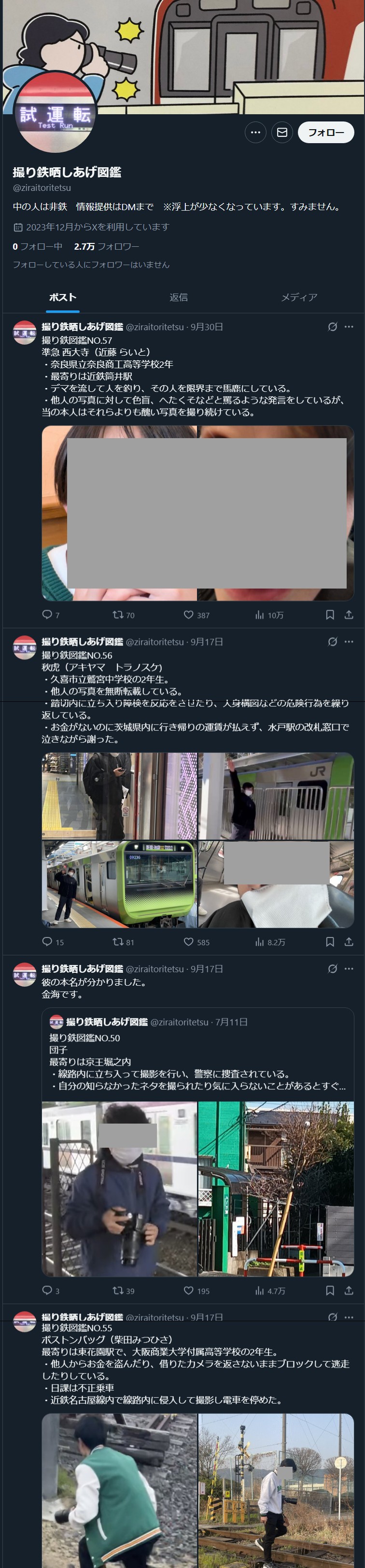 … | 69無念Nameとしあき25/10/15(水)23:19:44No.1359023914+>撮り鉄問題 |