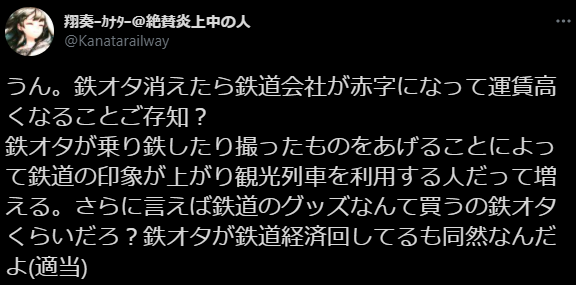 … | 21無念Nameとしあき25/10/15(水)22:52:15No.1359017207そうだねx4>撮り鉄をひとくくりにするのならアニメオタクがひとくくりにされるのもやむを得なくなるな |