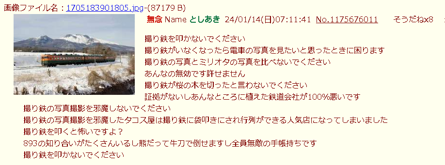 … | 580無念Nameとしあき25/10/16(木)11:56:59No.1359093678+>撮り鉄ってなんで弱いくせにイキるの? |
