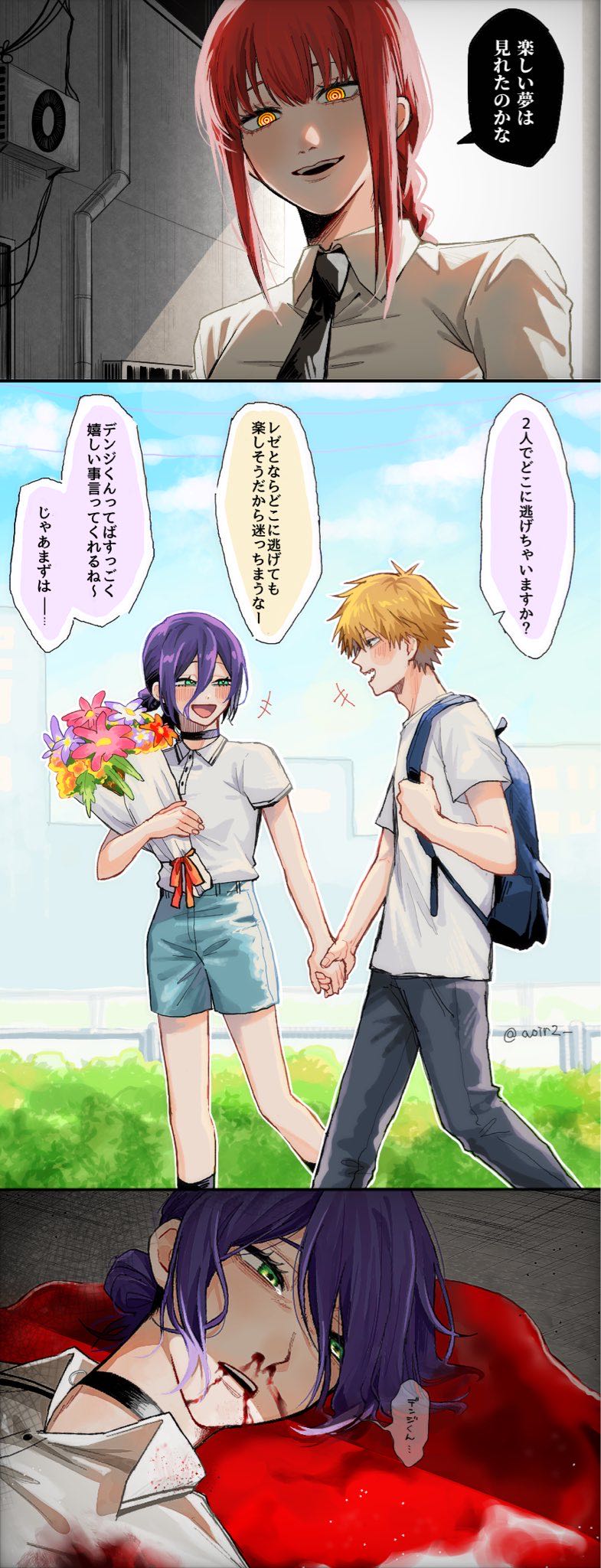 … | 620無念Nameとしあき25/10/19(日)17:33:35No.1359911060そうだねx1デンジが花屋で女性に贈る花束をくださいって注文したと思うと待ちぼうけの表情がグサグサ刺さる |
