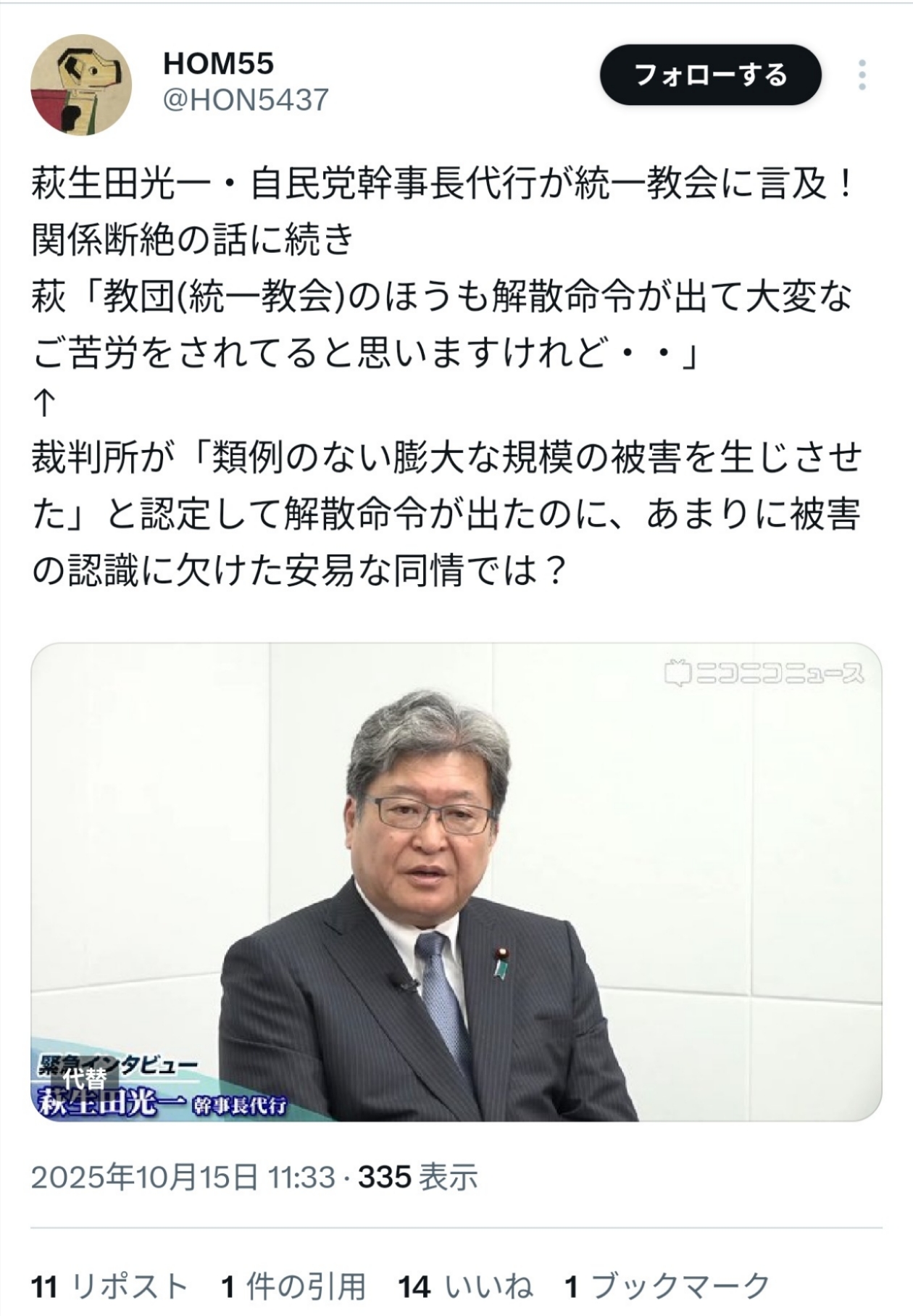 … | 948無念Nameとしあき25/10/19(日)15:33:30No.1359878738+>>森山ってもう幹事長から外れるのに馬鹿でしょ君 |