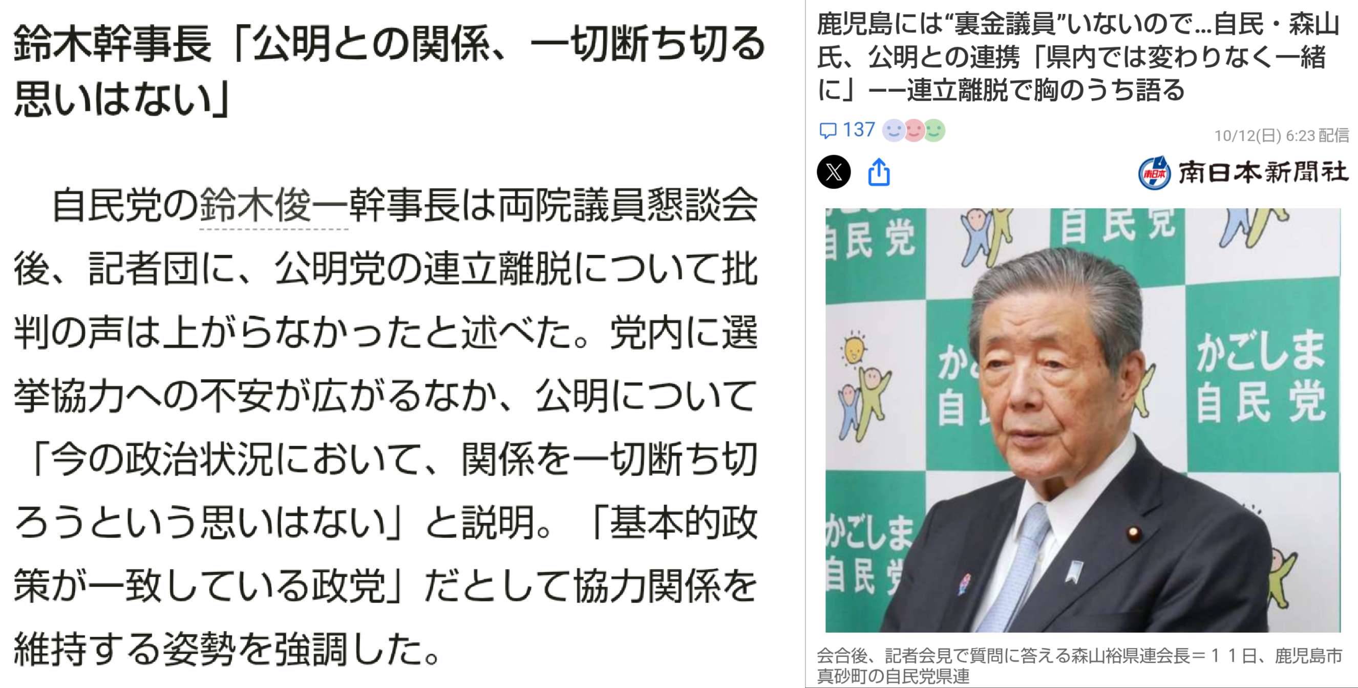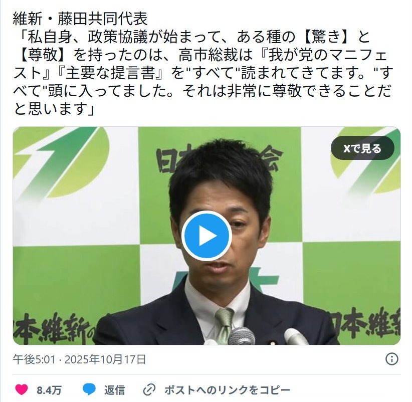 … | 23無念Nameとしあき25/10/19(日)12:47:49No.1359840227そうだねx8>「政策を進めるため高市氏に協力する」 |
