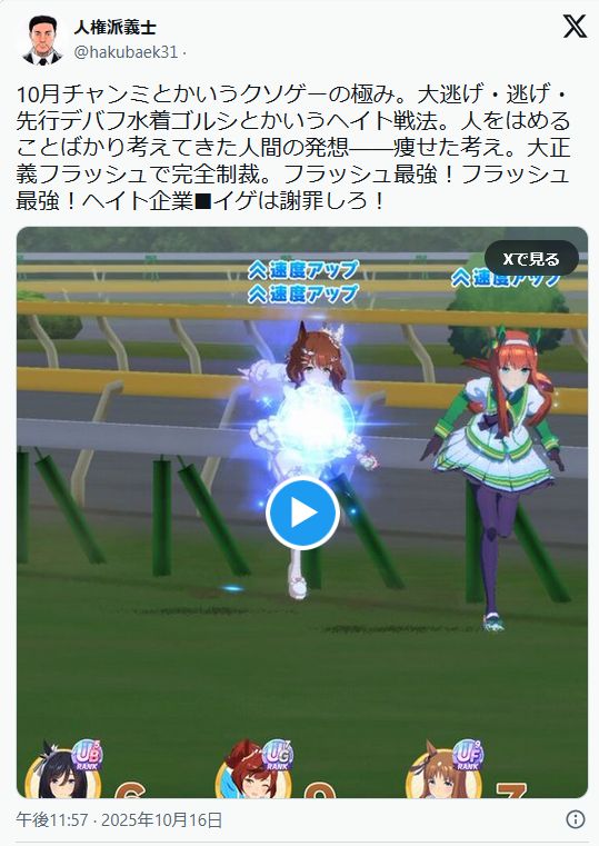 … | 139無念Nameとしあき25/10/19(日)19:25:27 IP:14.9.*(enabler.ne.jp)No.1359940911そうだねx3 1760869527858.jpg-(70175 B) ![]() >>レース競技でデバフってなんだよ… |