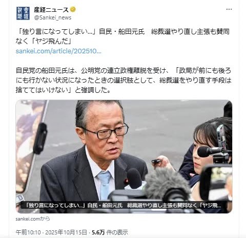 … | 929無念Nameとしあき25/10/21(火)13:17:15No.1360339462+>自民党「なんかえらいことになってるな・・・」 |