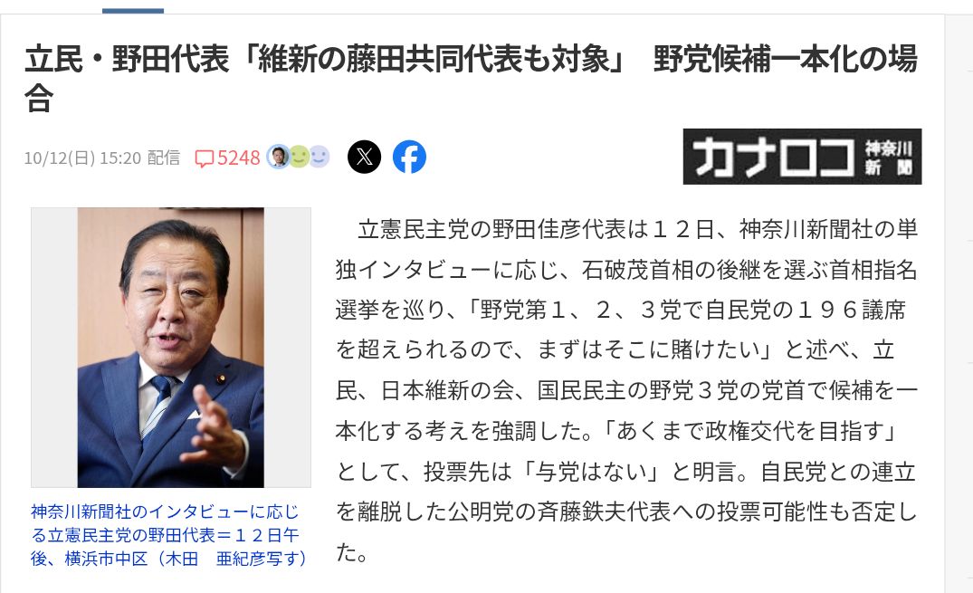 … | 997無念Nameとしあき25/10/21(火)14:32:54No.1360351258+>総理になる覚悟も無い野田の名前を書く立憲の惨めさよ |