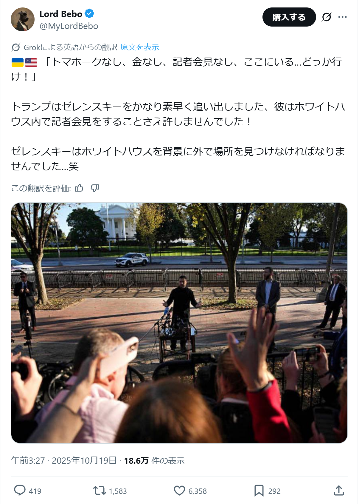 … | 17無念Nameとしあき25/10/21(火)09:08:33No.1360300228そうだねx1おいっトランプトマホークくれよ |