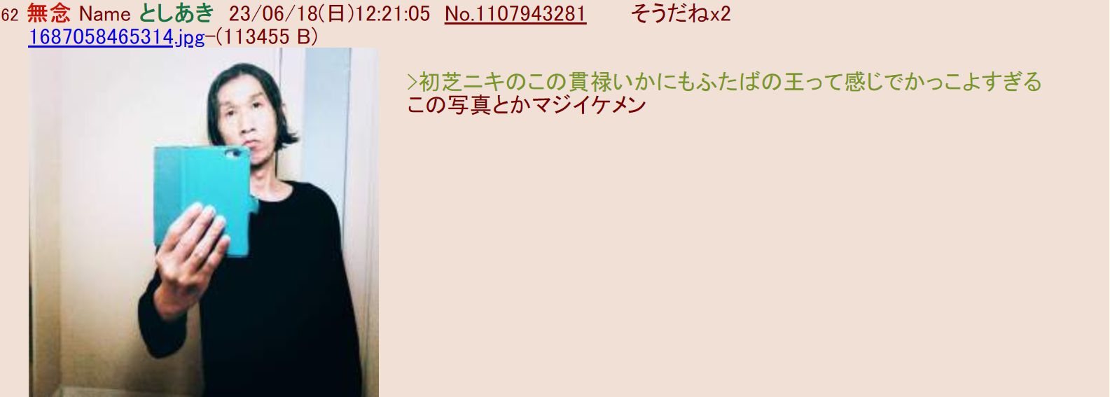 … | 104無念Nameとしあき25/10/22(水)18:04:24No.1360604989+ 1761123864523.jpg-(63905 B) ![]() 初芝が自身で自撮り写真を二次裏に投稿したときに確信したよ |