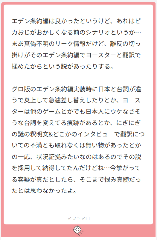 … | 925無念Nameとしあき25/10/23(木)01:53:43No.1360712453そうだねx2KV当時あったリークっぽい何かだと翻訳の時の改変というよりはプロットとかそういうもっと前の段階での干渉みたいなもののように思えた |