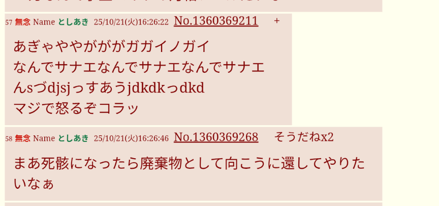 … | 10無念Nameとしあき25/10/23(木)10:19:39No.1360743669そうだねx2荒らしの泣き言スレ |