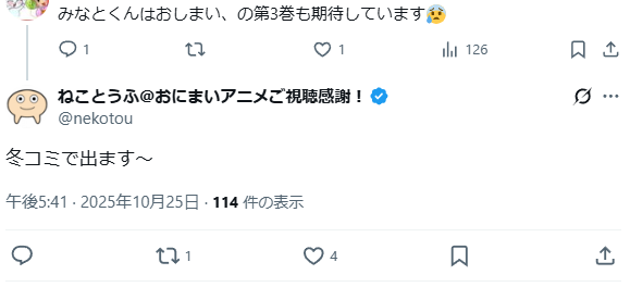 | … | 181無念Nameとしあき25/10/25(土)21:07:24No.1361351009そうだねx1冬コミ近いしみよまひあおまひ回だったり |