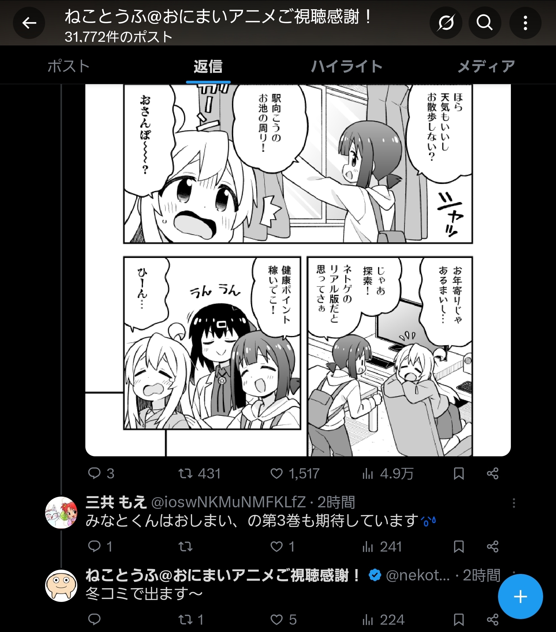 | … | 133無念Nameとしあき25/10/25(土)20:27:49No.1361337219+ 1761391669438.jpg-(909677 B) >>みなまい3巻みんな出ると思ってたのか流石にこの時程の反応はないな |