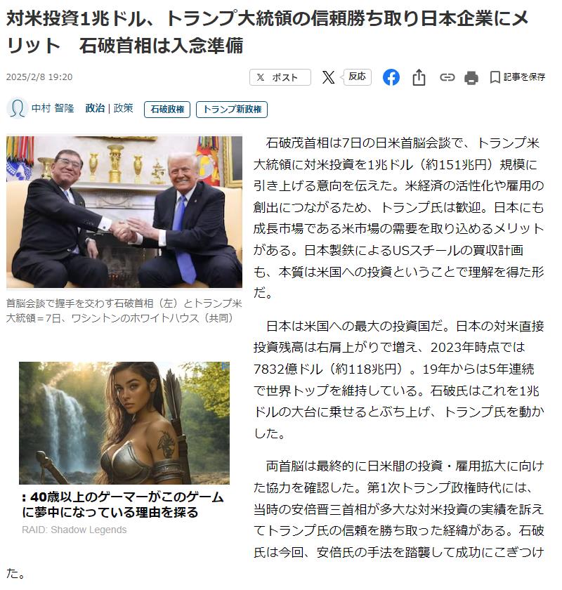 | … | 12無念Nameとしあき25/10/26(日)02:25:50No.1361426922そうだねx3>こういう時って、世界最大の軍事大国に1兆ドルもの投資を決定した石破茂政権はろくに批判されずスルーされるのなんでだろう |