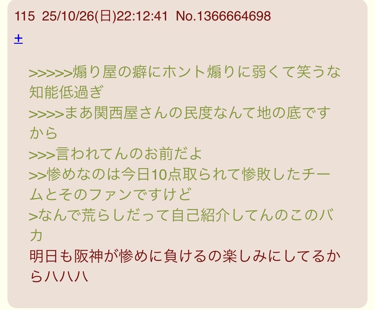 | … | 457無念Nameとしあき25/10/27(月)17:13:27No.1361806389そうだねx1このスレで煽り合ってるのは阪神もソフトバンクも別に好きじゃない連中なんだろうな |