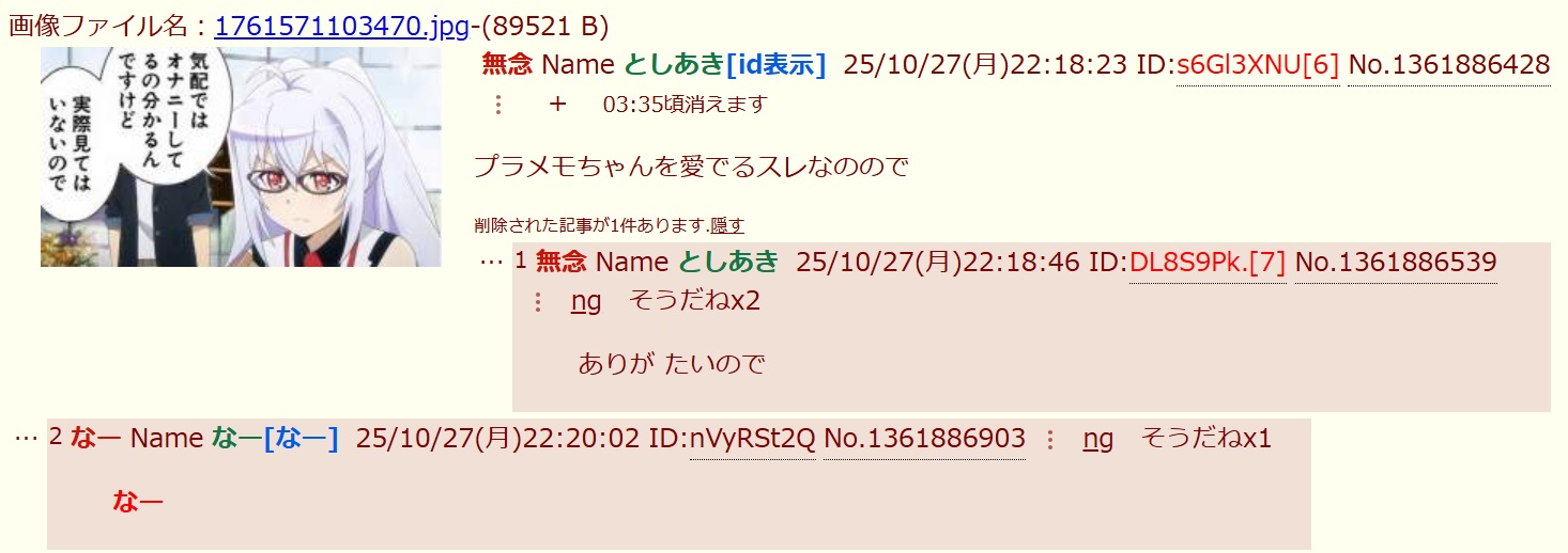 | … | 58無念Nameとしあき25/10/28(火)00:48:40 ID:DL8S9Pk.No.1361917929+3つのdelが集まりし時レスは削除されん── |