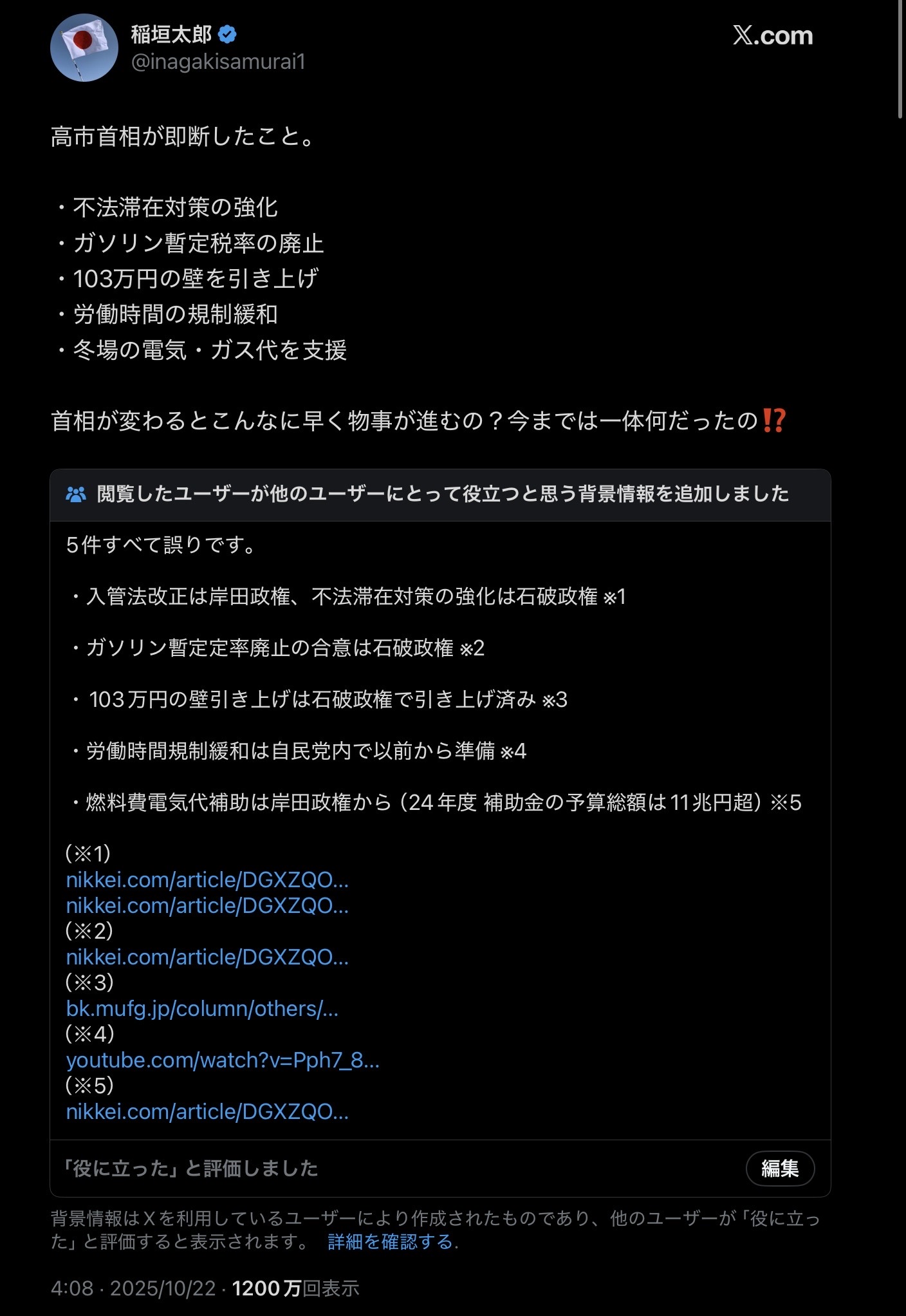 | … | 4無念Nameとしあき25/10/27(月)22:21:25No.1361887324そうだねx17なにも行動しない総理よりはまし |