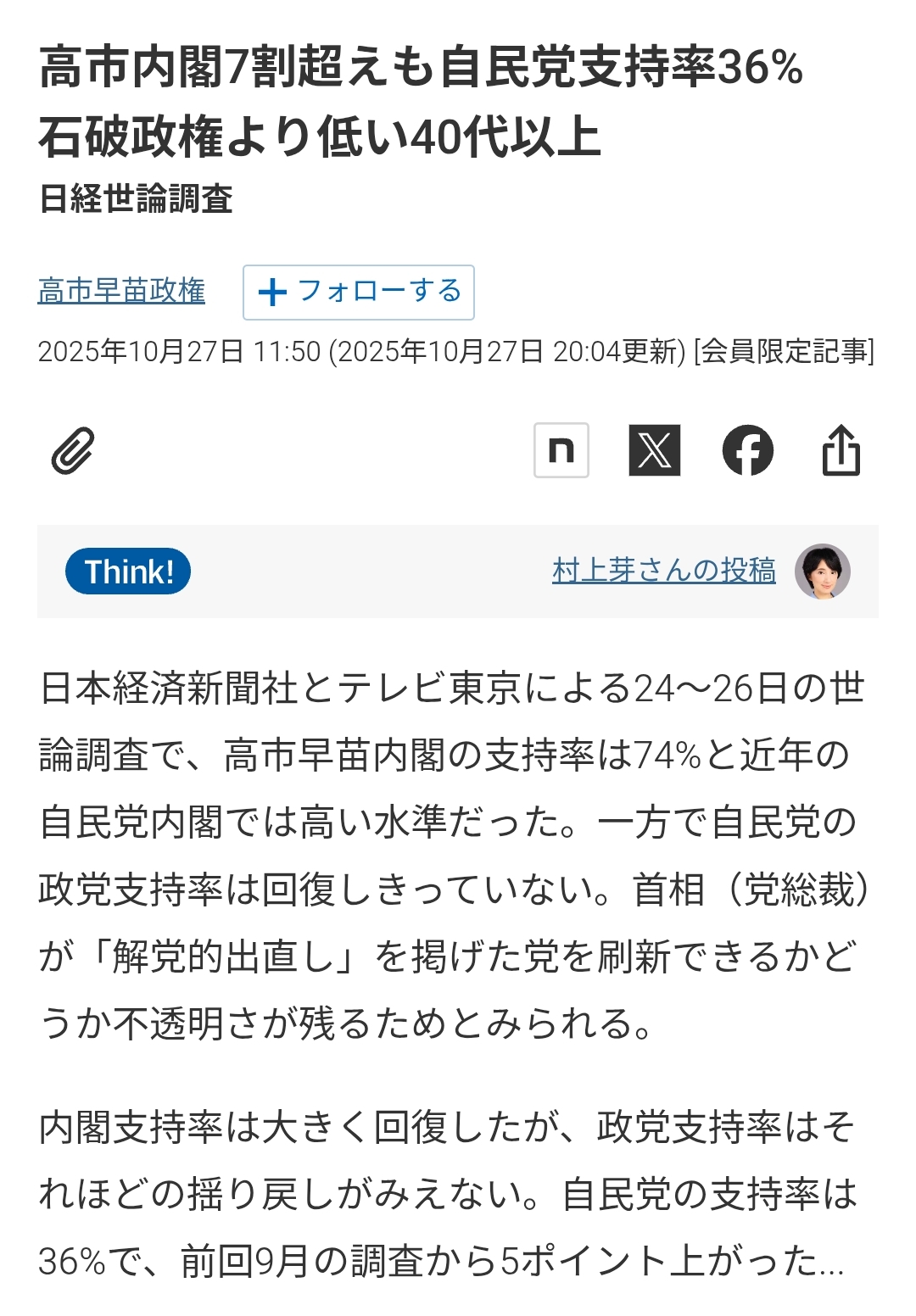 | … | 718無念Nameとしあき25/10/28(火)01:35:11No.1361922845+>高市内閣7割超えも自民党支持率36% 石破政権より低い |