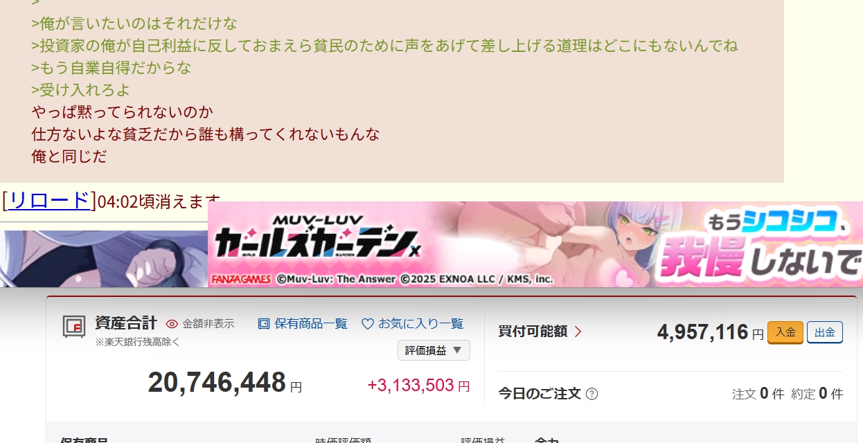 | … | 736無念Nameとしあき25/10/28(火)01:46:06No.1361923698+>>投資家のわいが言いたいのはこれだけ |