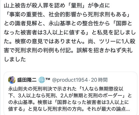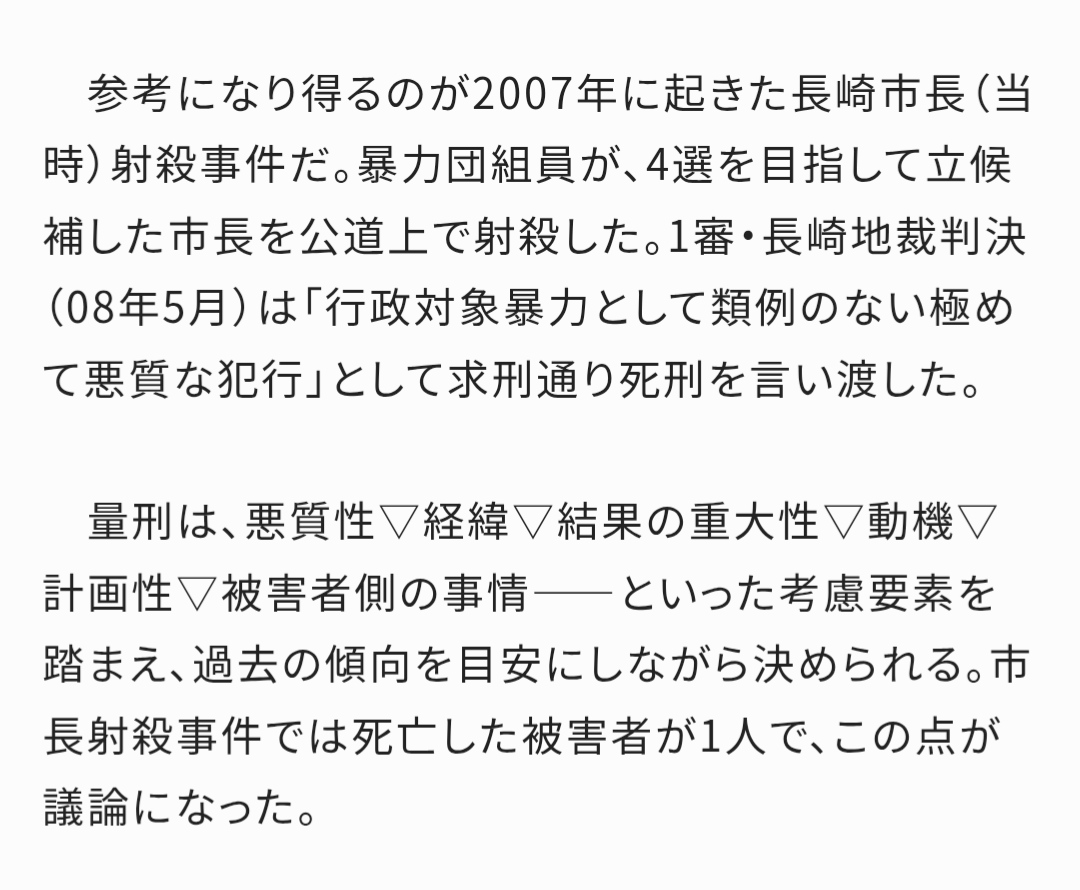 | … | 41無念Nameとしあき25/10/30(木)15:47:38No.1362473875+ >検察は「国葬となった被害者は3人以上に値する」と見なし死刑求刑の方向。 |