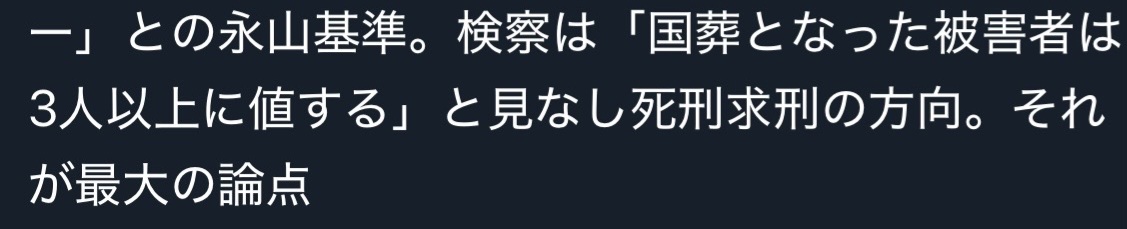 | … | 24無念Nameとしあき25/10/30(木)15:42:58No.1362473216そうだねx3 >「国葬となった被害者は3人以上に値する」と見なし死刑求刑の方向 |