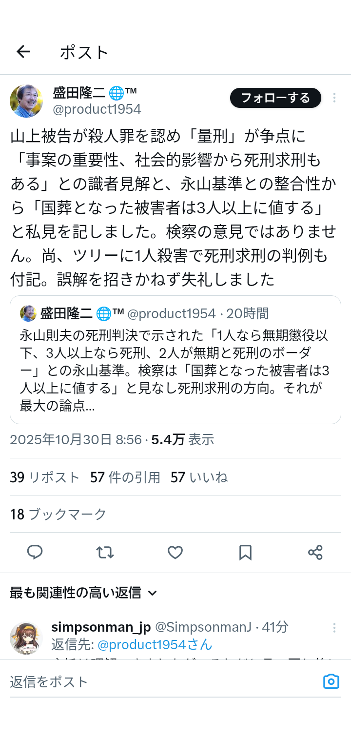 | … | 15無念Nameとしあき25/10/30(木)15:40:59No.1362472930+ 社会的地位による影響力の差は判決に影響するなんてそれこそ前からやってるし錦の旗みたいに掲げてる永山基準なんてとっくの昔に形骸化してるんだからどうなるかは裁判やってみないとわからないなんて散々言われてただろうに今更何言ってんだ? |