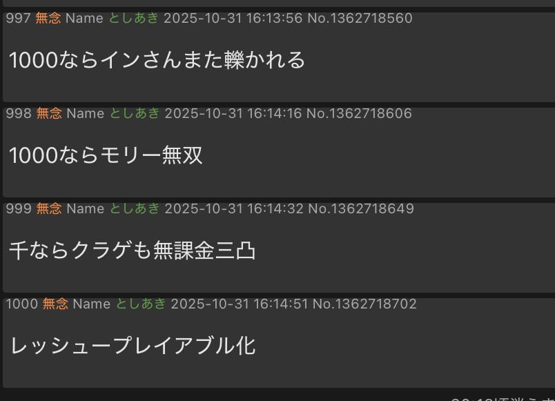 | … | 20無念Nameとしあき25/10/31(金)16:21:21No.1362719738+ レッシューのレスが多い! |