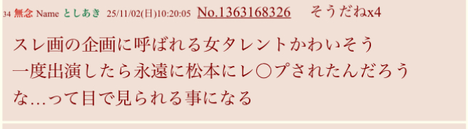 | … | 104無念Nameとしあき25/11/02(日)11:56:07No.1363191701+>レイプ否定できなかった松本の負けだぞ? |
