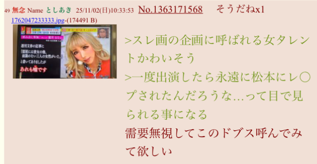 | … | 49無念Nameとしあき25/11/02(日)10:33:53No.1363171568そうだねx5 1762047233333.jpg-(174491 B) >スレ画の企画に呼ばれる女タレントかわいそう |