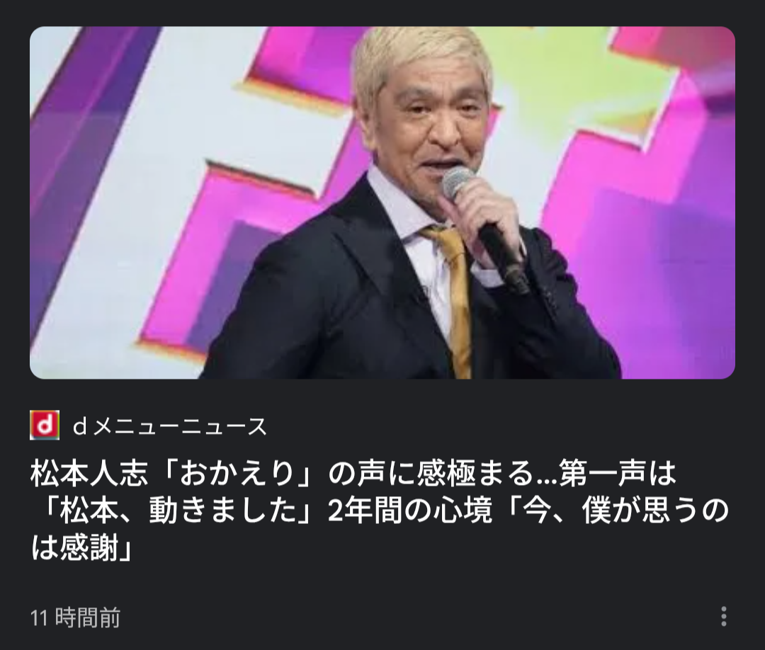 | … | 128無念Nameとしあき25/11/02(日)12:12:19No.1363196093そうだねx4>>「松本動きました」と第一声。「日本のお笑いがしんどいと聞きまして、私、復活することにしました。 |
