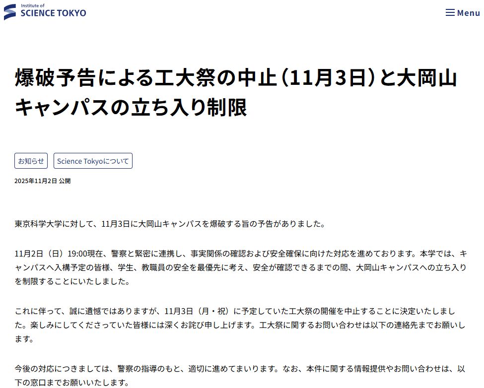 | … | 67無念Nameとしあき25/11/03(月)11:24:40No.1363472576そうだねx1 1762136680340.jpg-(99892 B) >3日目 東京科学大の学祭を見て…こようとしたら爆破予告でナシになった!まじくそ |