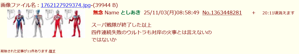 | … | 76無念Nameとしあき25/11/03(月)15:38:39No.1363525952+>スーパ戦隊が終了した以上  |