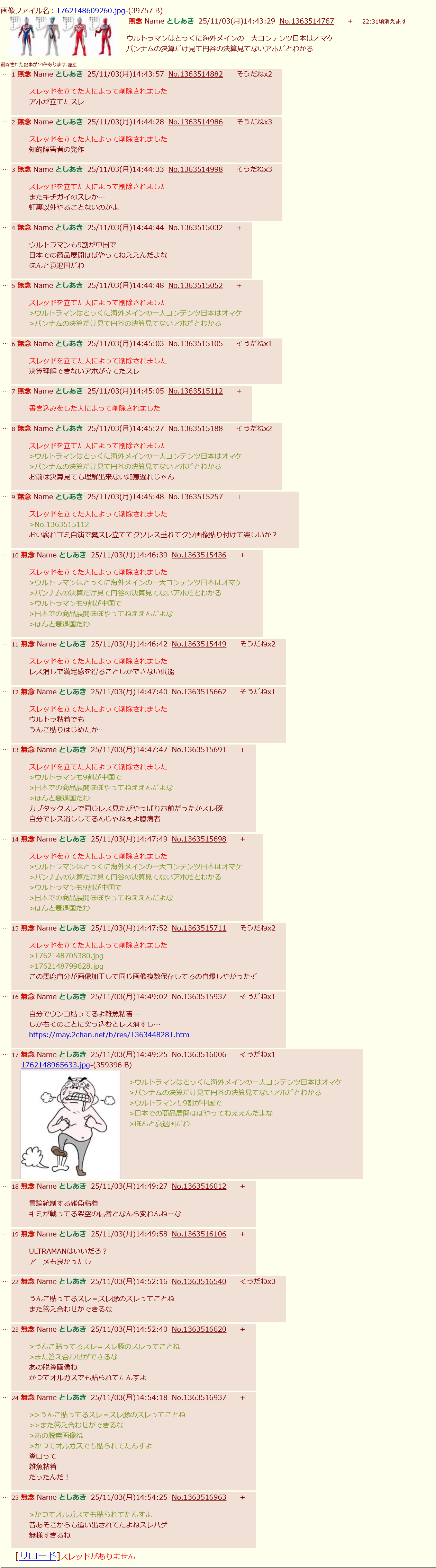 | … | 15無念Nameとしあき25/11/03(月)09:05:12No.1363449152そうだねx2四作連続失敗のウルトラはうんこだから仕方ないな  |