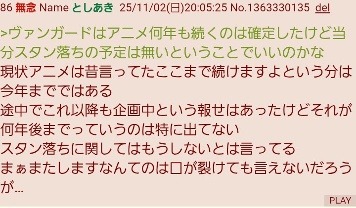 | … | 84無念Nameとしあき25/11/03(月)10:50:48No.1363466296+>>ヴァンガードのPスタンくらいの感覚かと  |