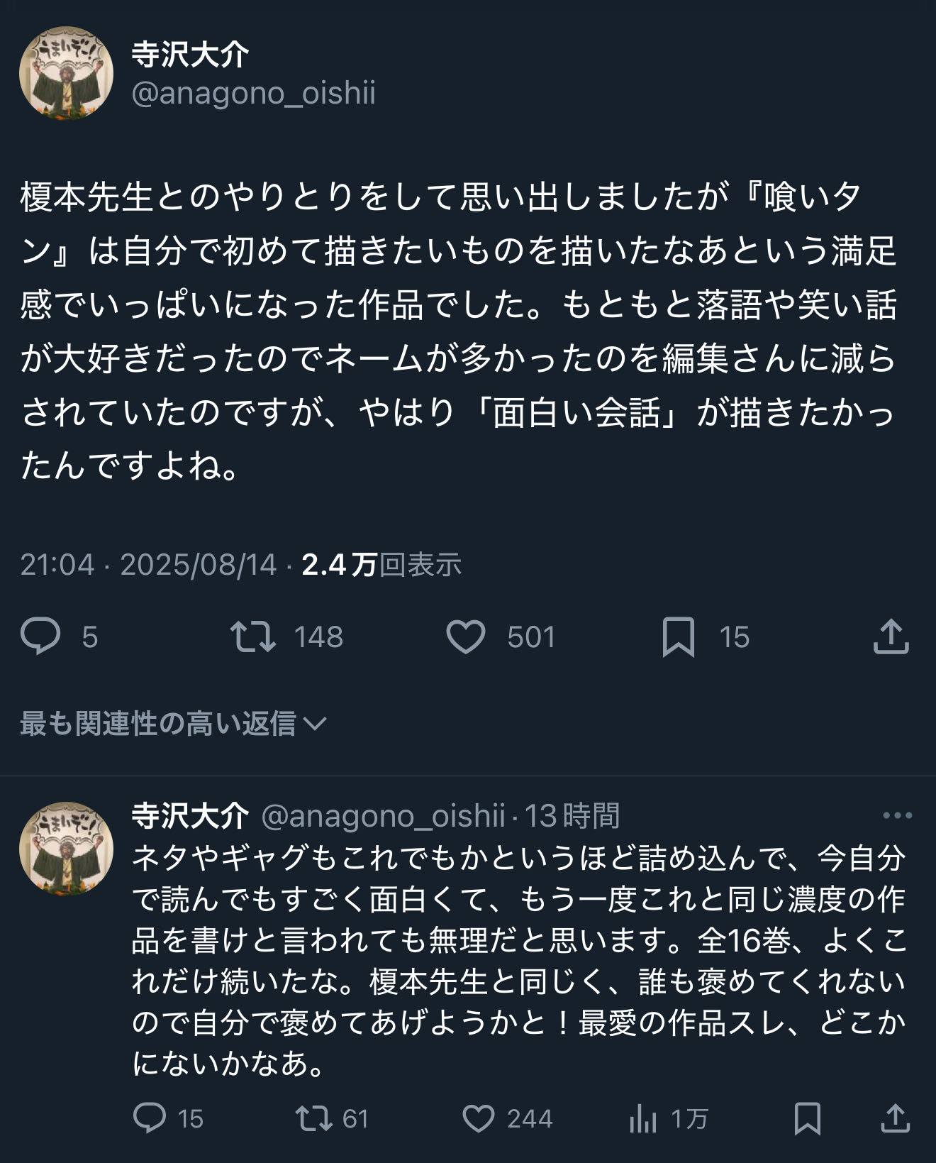 | … | 4無念Nameとしあき25/11/03(月)10:07:10No.1363458523そうだねx2>殺人絡まない話が結構多くて好き  |