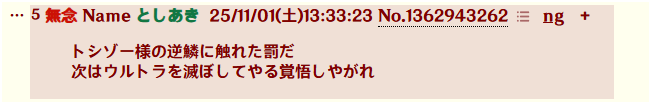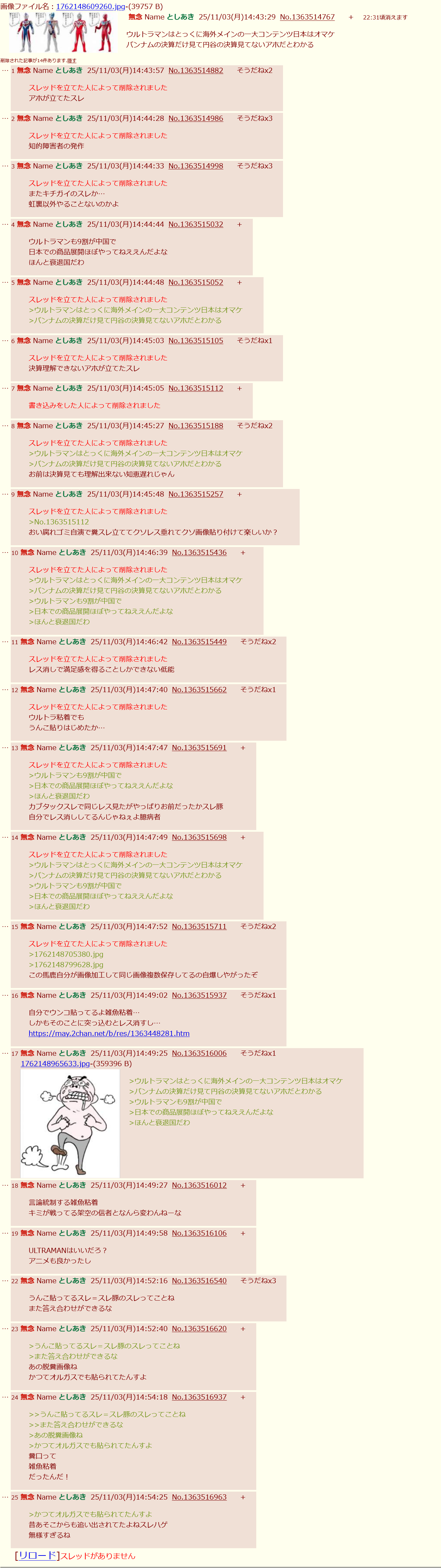 | … | 29無念Nameとしあき25/11/03(月)15:00:45No.1363518117+特撮キモオタはなぜすぐキレるのか? |