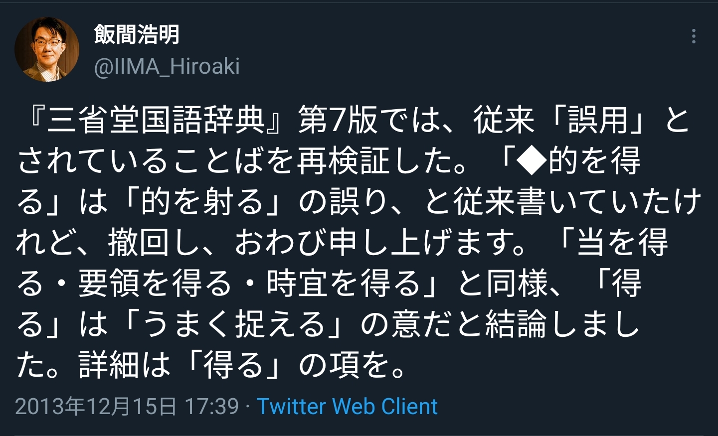 | … | 37無念Nameとしあき25/11/04(火)12:13:18No.1363716366そうだねx9>>三省堂国語辞典は、この「的を得る」という表現を長らく誤用として扱ってきたが、改版にあたり再検証を実施、その結果、「得る」の字義を「うまく捉える」の意と捉えれば「的を得る」も誤用とは当たらないと結論づけ、《「的を得る」は「的を射る」の誤り》という従来の記述を撤回している。 |