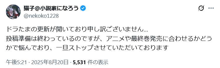 | … | 884無念Nameとしあき25/11/04(火)22:27:23No.1363842653+>漫画はもう無理ってなったらさっさと畳むけどラノベは実質打ち切りでも読者に未告知のまま放置が多い印象はあるな |