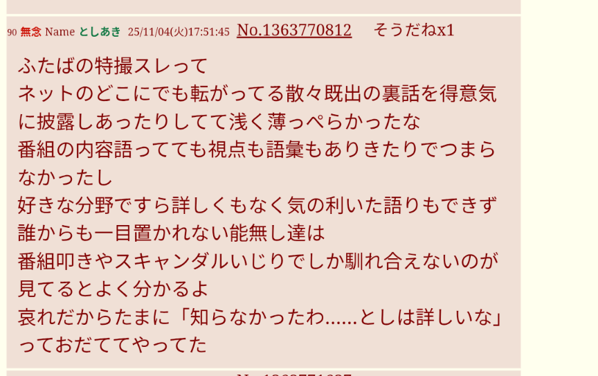 | … | 123無念Nameとしあき25/11/04(火)20:40:47No.1363811787そうだねx1虐厨でさえ管理人からふたばに居場所を与えられたのに一方全拒否されたさつよこ民はそれ以下の扱いってことなんすねぇ |