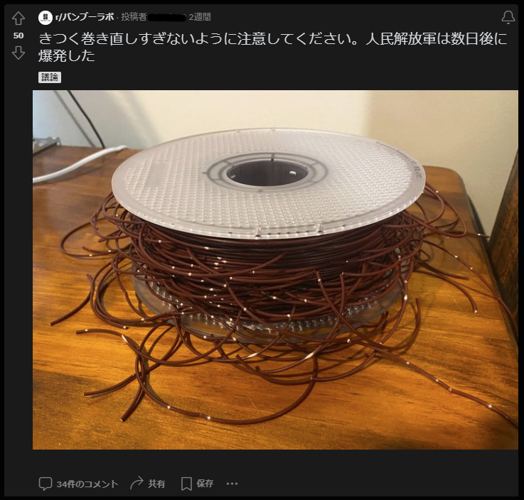| … | 12無念Nameとしあき25/11/04(火)20:50:03No.1363814510+何かに使えないかなと思って溜めてたフィラメントのスプールいい加減に捨てたい |