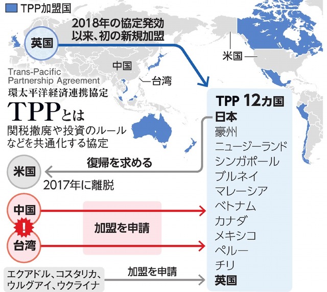>>12の現加盟国全ての了解が得られれば加入作業部会を設置して交渉を始める。加盟には幅広い品目での関税撤廃や引き下げのほか、知的財産保護や環境・労働法制の整備などで基準を満たすことが必要になる。