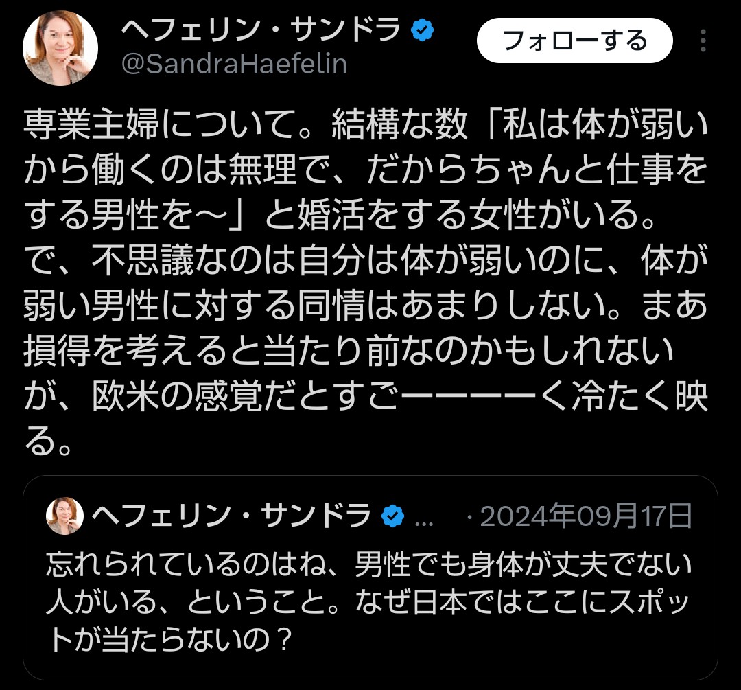 | … | 550無念Nameとしあき25/11/05(水)10:45:44No.1363915410そうだねx2地位や収入では平等だと言いながら実際は女が男に頼るというマインドはそのままなので |