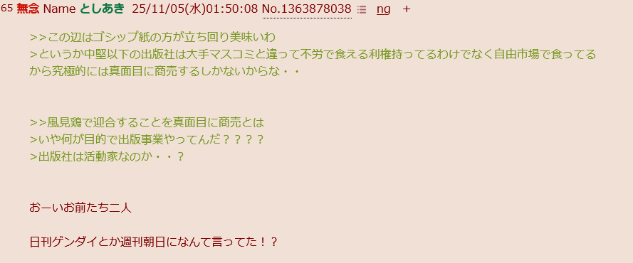 | … | 65無念Nameとしあき25/11/05(水)01:50:08No.1363878038+>>この辺はゴシップ紙の方が立ち回り美味いわ |