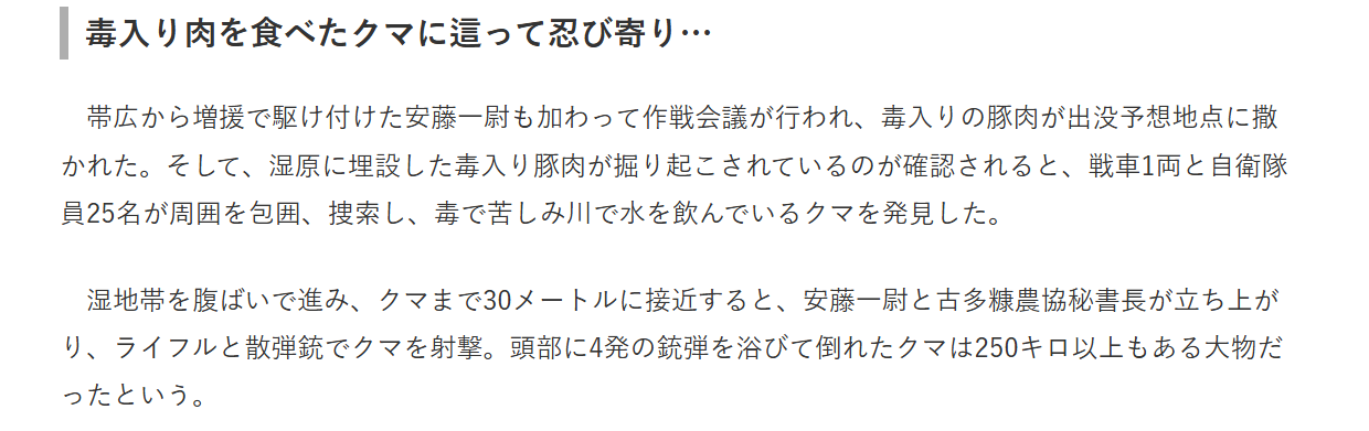 | … | 25無念Nameとしあき25/11/06(木)20:39:08No.1364245203そうだねx3>まず熊は心臓か眉間の狭いところを大口径のライフルで撃ち抜くしか確実に殺すことはできない |